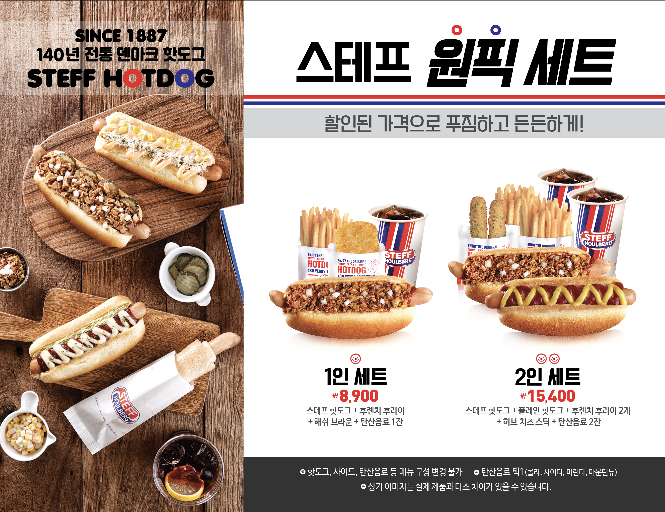 할인된 가격으로 푸짐하고 든든하게! 스테프 원픽 1~2인 세트 출시! 좀 더 푸짐하게 즐길 수 있는 원픽 1인 세트와 2인 세트를 할인된 가격으로 만나보세요! ※ 본 세트는 김포공항점에서만 판매됩니다.